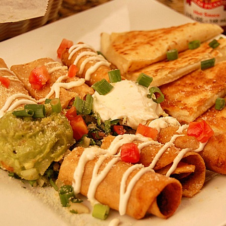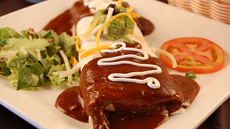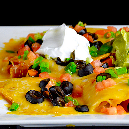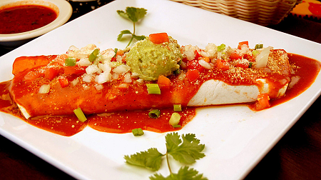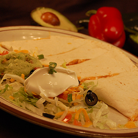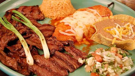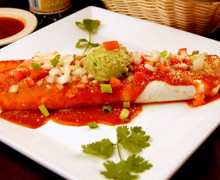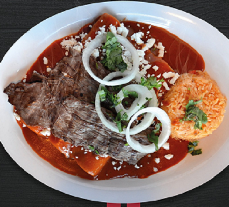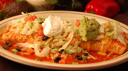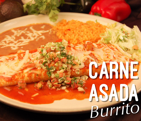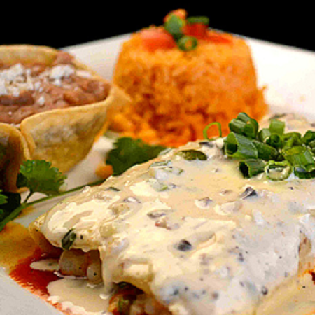 Served w/rice & refried beans (whole black beans or pinto beans are available) Add Sour Cream 1.25 Add Guacamole 1.50 on top. Shredded beef add .75¢ each item
